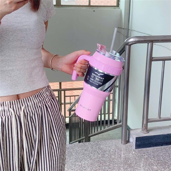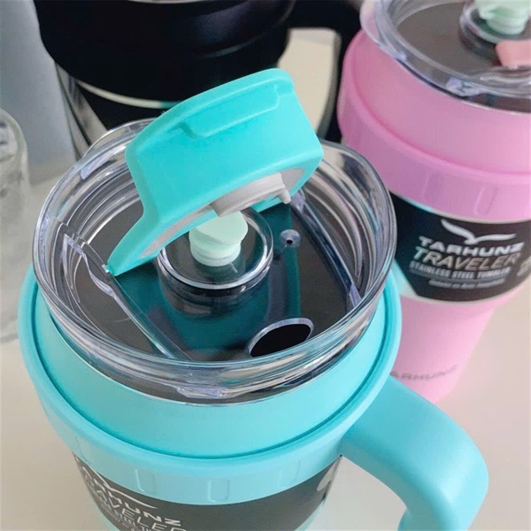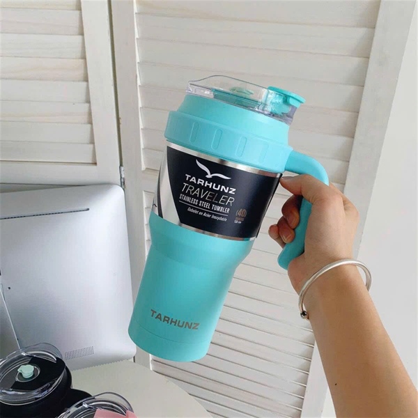 Bình giữ nhiệt TARHUNZ Traveler chất liệu inox 304 an toàn, có tay cầm và nắp chống tràn với ống hút tích hợp.